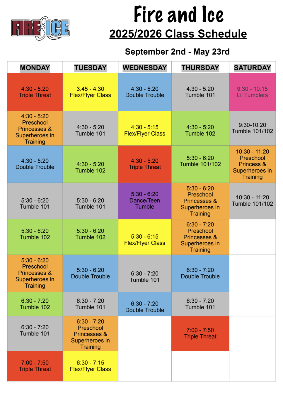 Tumble 101 – This is our entry level tumbling class. Focused on forward rolls, handstands, cart wheels, round-offs, standing backbends, and kickovers. Stunt Stands will also be available. Ideal for athletes who want to learn to tumble, are interested in cheerleading, or basic strength and flexibility. Required to enroll in this class: Ability to stay on task and work towards progressing in strength & skills, and an excitement to learn! Calendar color is Gray